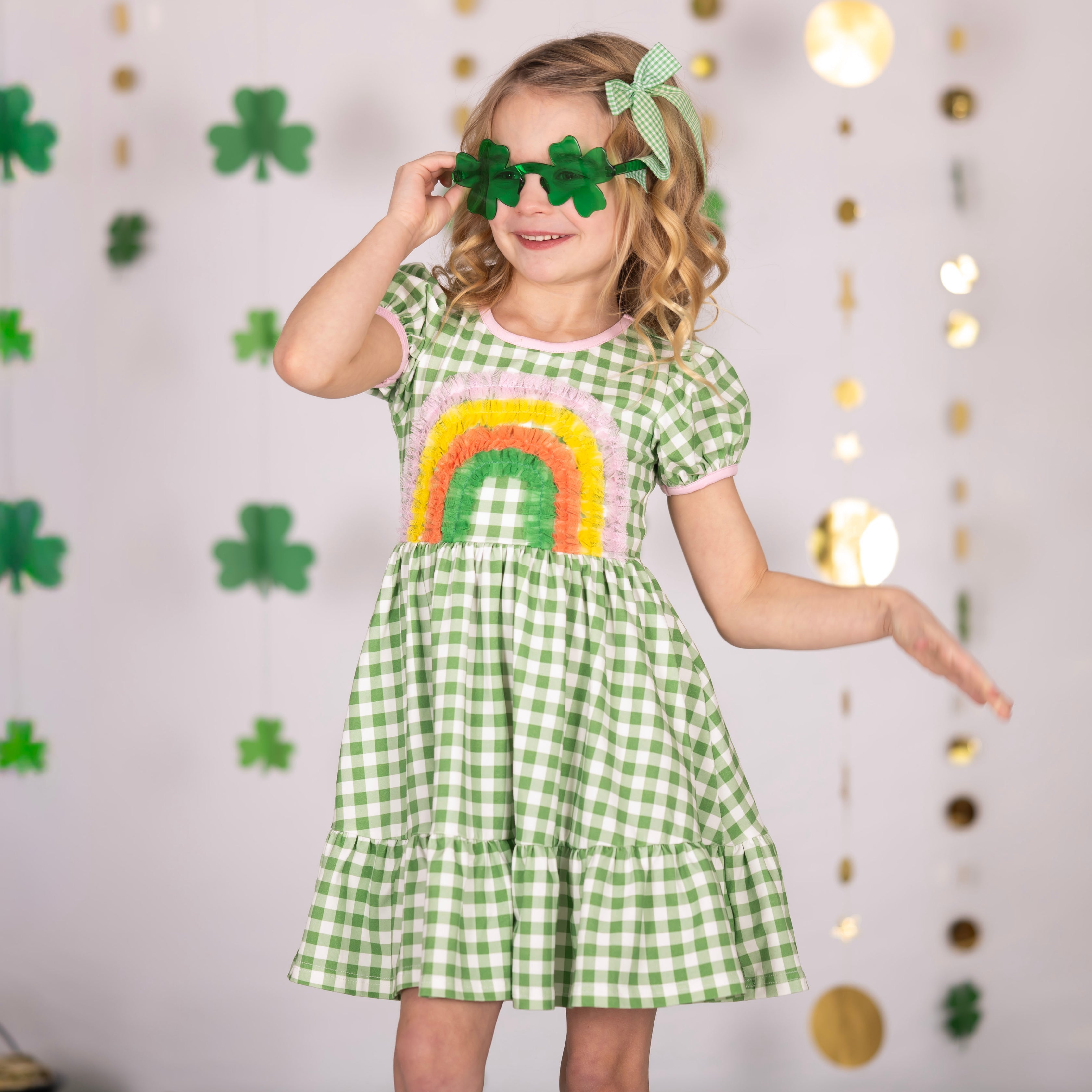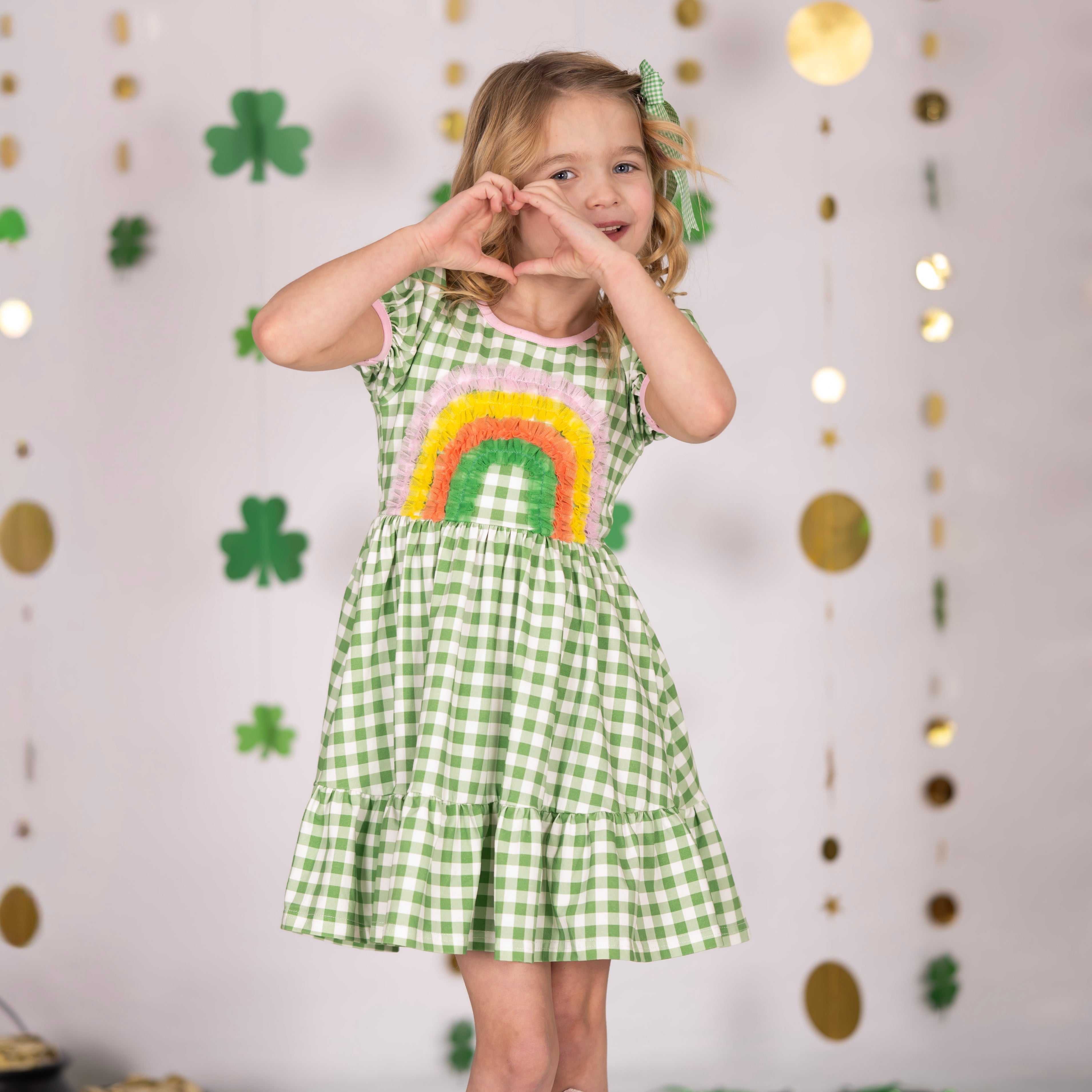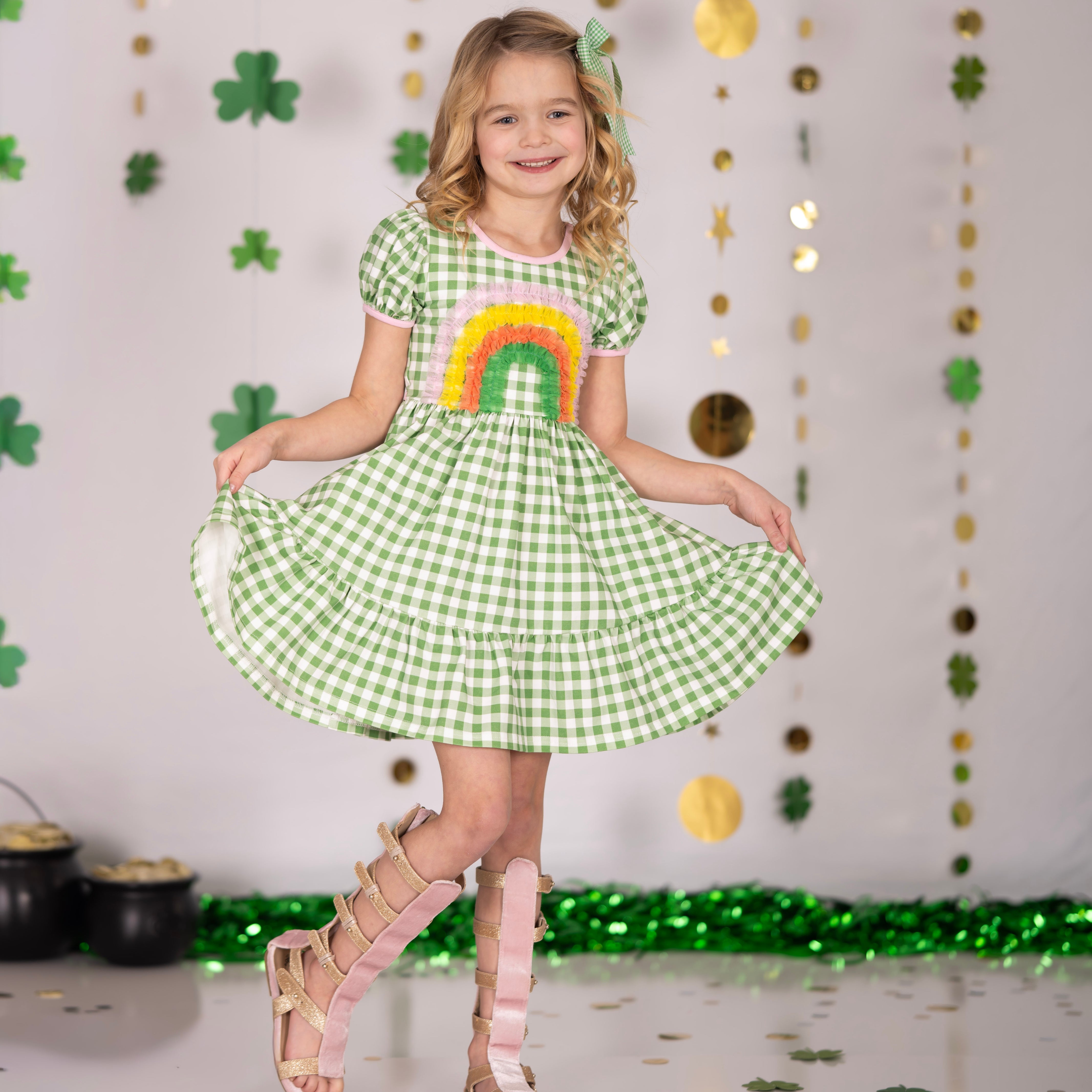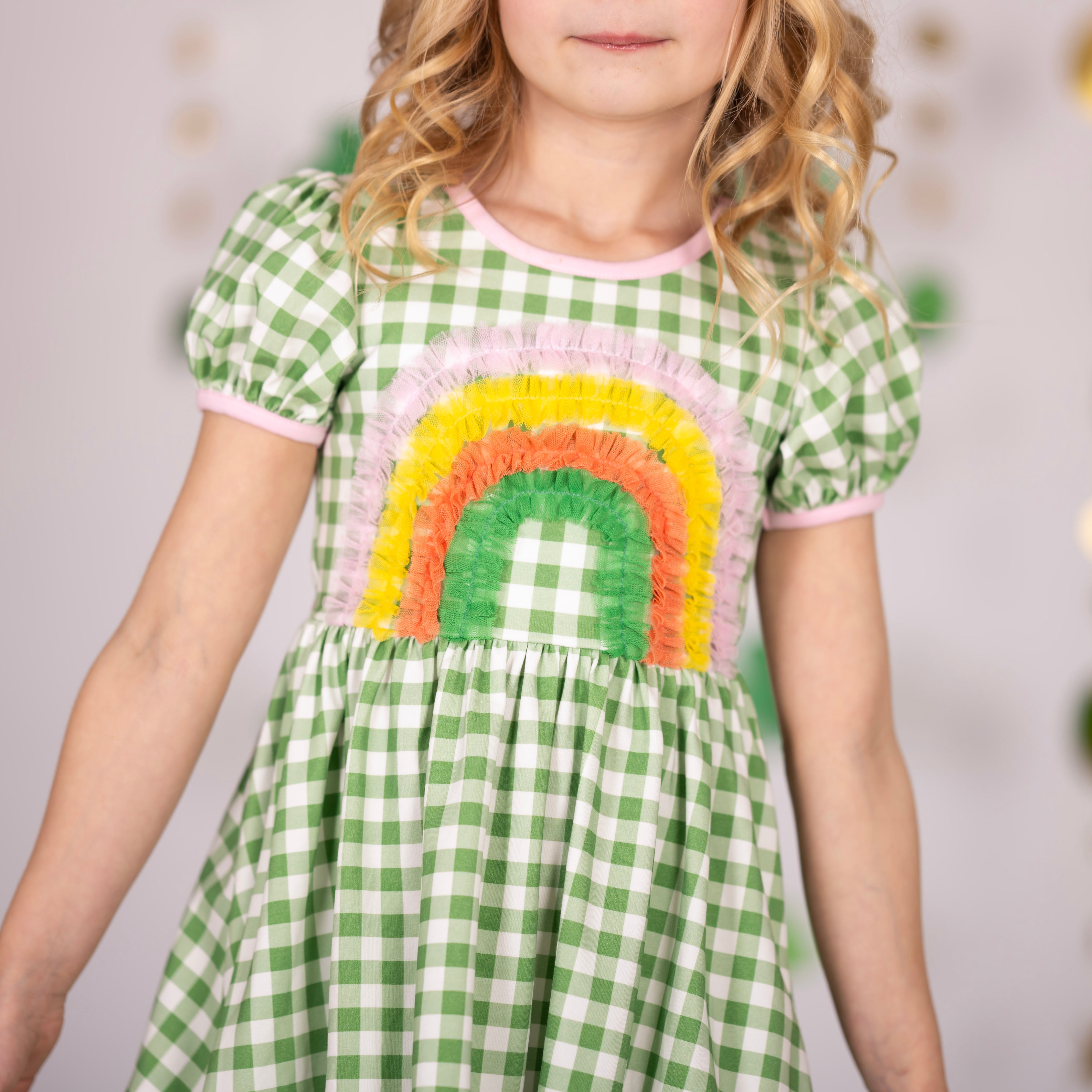 Our Clover Dress features classic green gingham with sweet pink trim and a playful rainbow detail—making it a charming choice for St. Patrick’s Day and beyond.